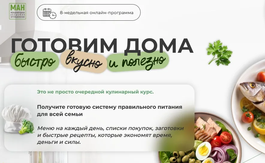 «Готовим дома быстро, вкусно и полезно» — восьминедельная онлайн-программа Международной Академии Нутрициологии. Обучение помогает выстроить систему питания для всей семьи без лишних затрат времени. Это прикладной курс по переходу на сбалансированный рацион, где теоретическая база подкрепляется реальным поварским опытом.
