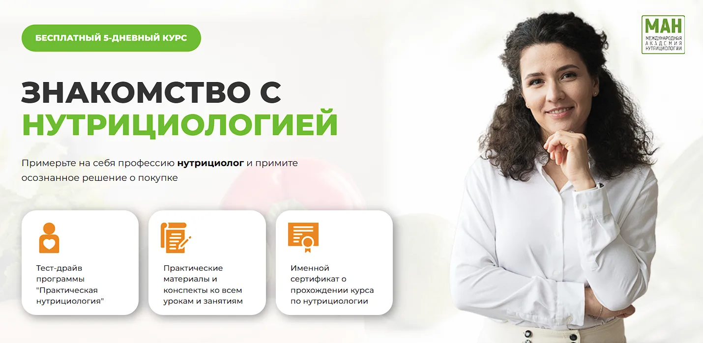 «Знакомство с нутрициологией» — это бесплатный 7-дневный доступ к программе профессиональной переподготовки «Практическая нутрициология».